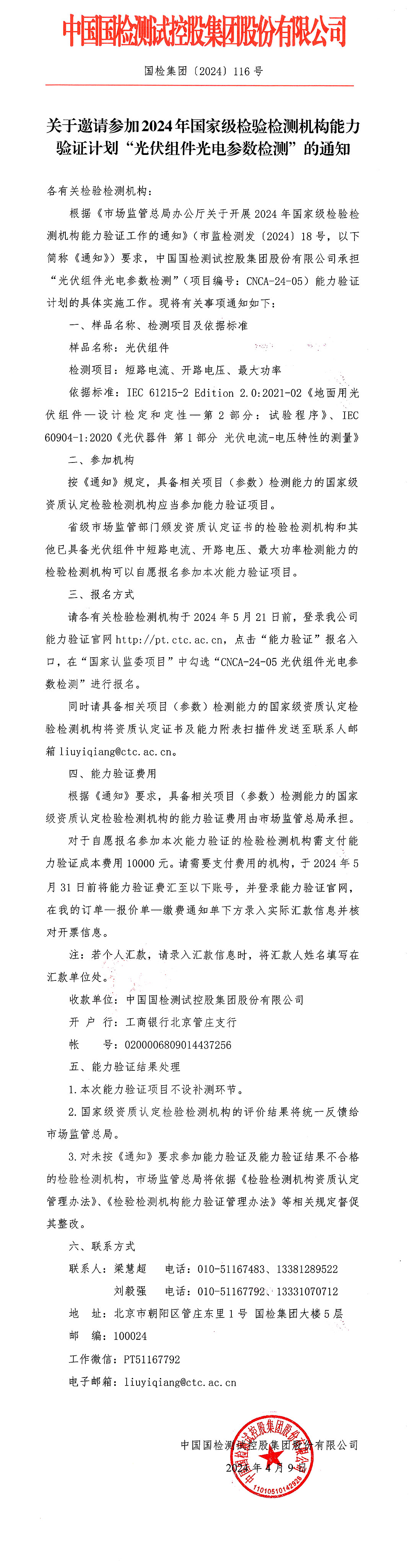 關(guān)于邀請參加2024年國家級檢驗(yàn)檢測機(jī)構(gòu)能力驗(yàn)證計(jì)劃“光伏組件光電參數(shù)檢測”的通知